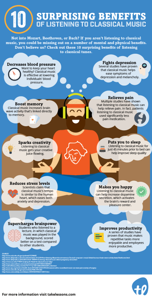 While the above graphic references classical music, there is power in all types of music if it is enjoyed. Teenagers and small children are often drawn to and enjoy listening to music through YouTube, television, movies and gaming. And while the mode of sharing music is mostly digital or online in the modern world, it is possible to access the classics from previous generations if this is what you enjoy.