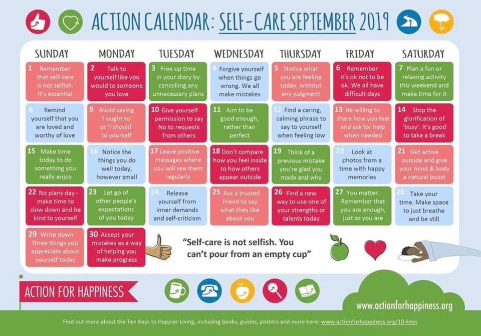 - Use an action calendar which reminds you to do something small for yourself each day (see the example below)